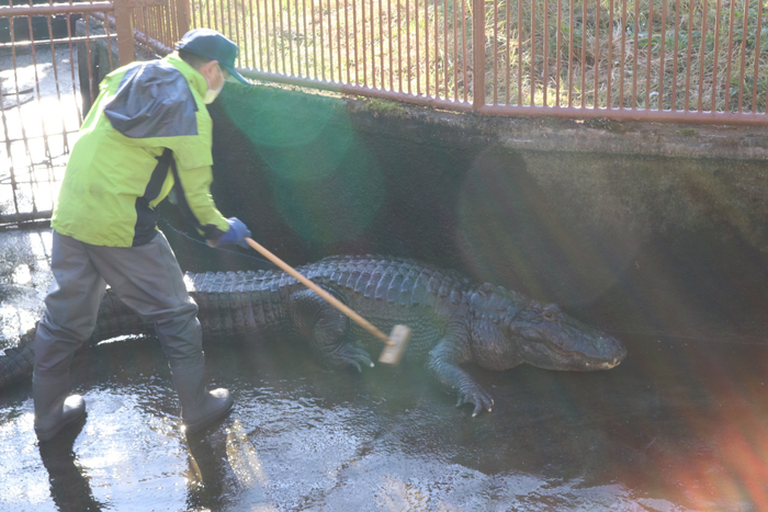 園内の大掃除の一環として始まり、いつもの掃除に比べ、より丁寧に、池の苔や汚れを落とすと同時に、ワニの背中の汚れも落とし、新年を迎える準備をいたします。
