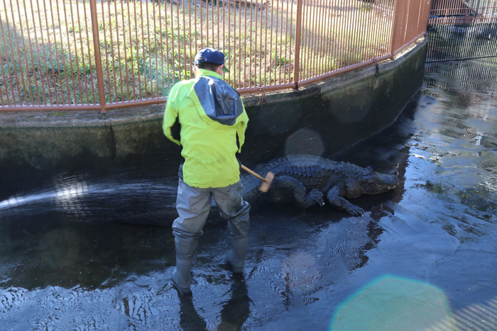 ワニの放流池の掃除に加え、ワニの背中のブラッシングも行い、新しい年を迎える準備をいたします。
