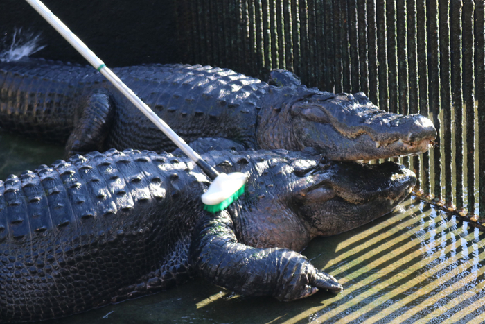 朝7時頃から池の水を抜き始め、開園時間の9時より、池の底や側面の掃除から始め、その後、ワニの背中の汚れを落とすためのブラッシングを開始いたします。