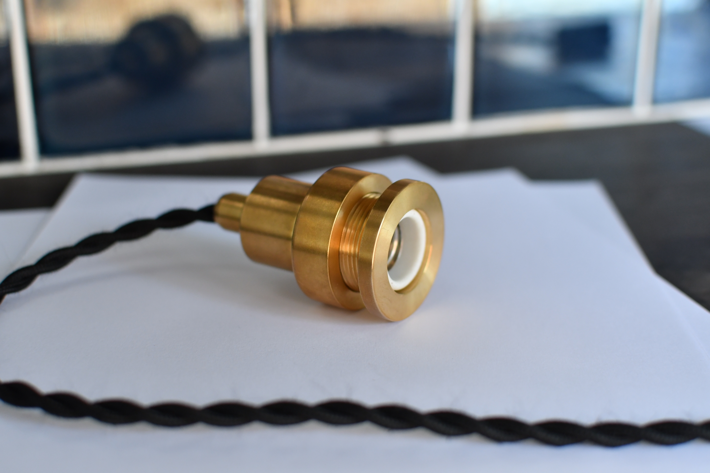 愛知県みよし市の金属加工会社、進興金属工業株式会社( https://e-shinko.co.jp/ )に灯具製作の協力をあおぎました。生産技術課の松浦 潤氏に輪島塗の漆器に合うよう、真鍮の削り出しで専用品をデザイン・設計していただきました。