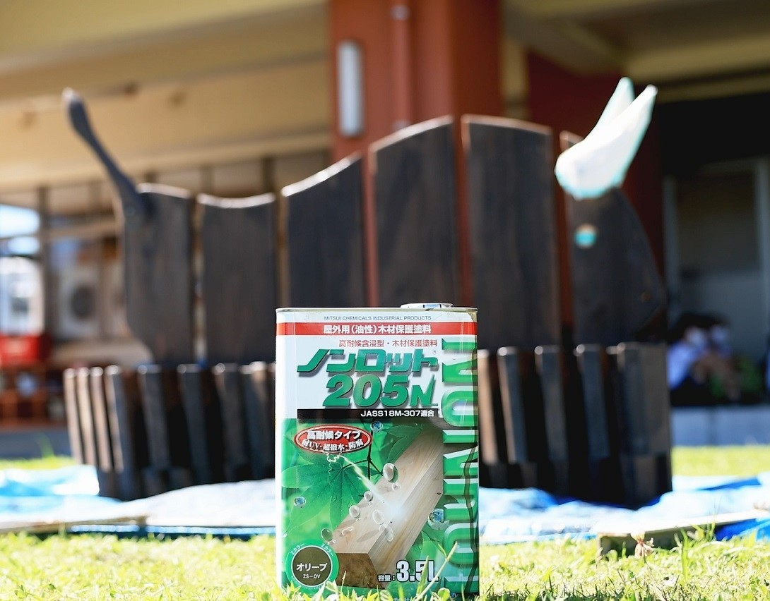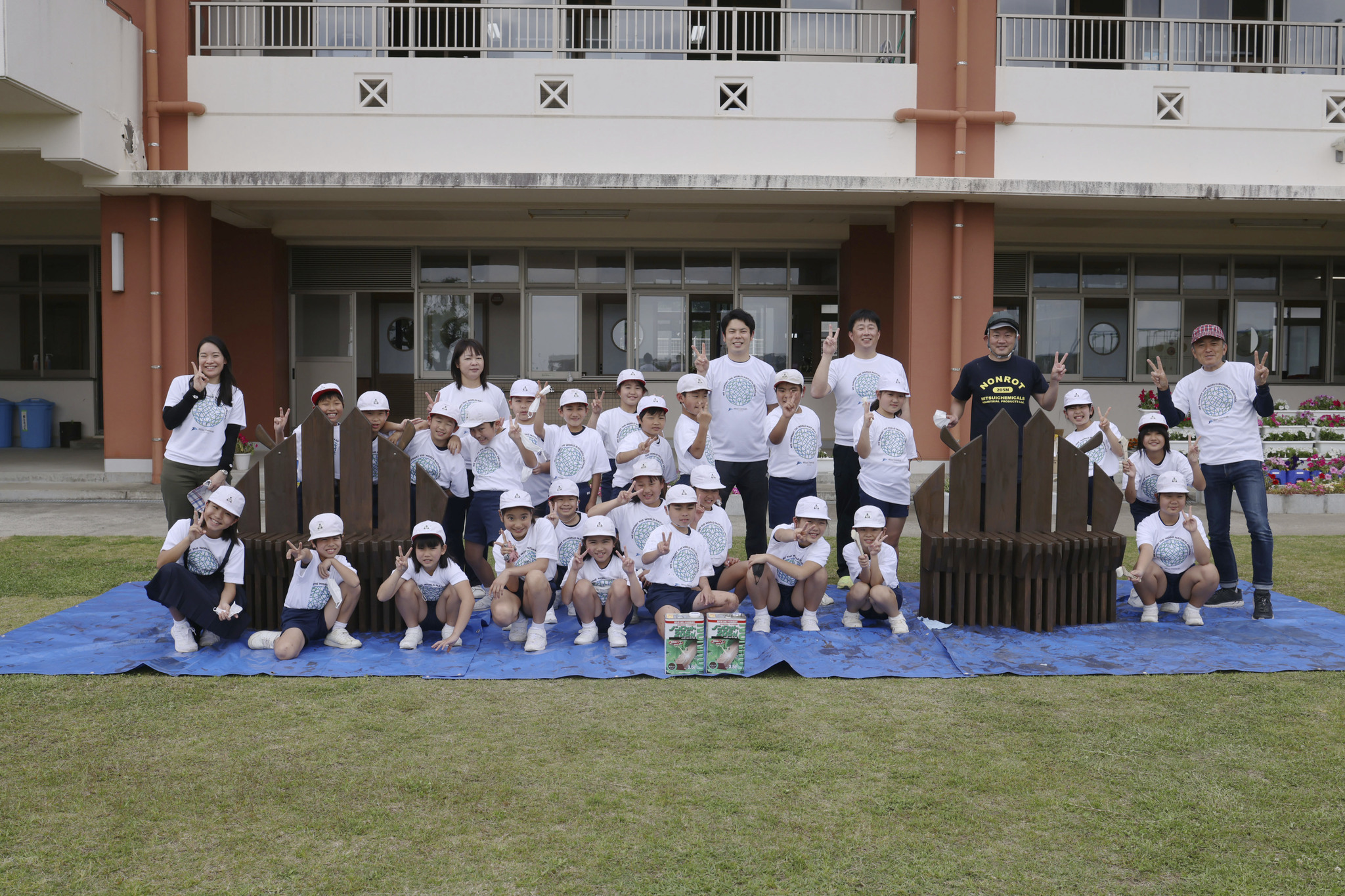 今回、天城町の協力のもと、岡前小学校(徳之島)にて、3回の出前授業を実施しました。まず3月には奄美大島出身の建築家である山下保博氏を講師に迎え、奄美建築及び建築やモノづくりに必要なコンセプト作りを学んだのち、実際にベンチのデザインをみんなで考えるワークショップを実施、子供たちは、みんなが幸せで100年座れるベンチなどをコンセプトに、徳之島の伝統「闘牛」と希少動物である「アマミノクロウサギ」をモチーフとした絵を描きました。その後、山下氏がこの絵をもとに設計し、鹿児島県産のスギ材を使用したベンチを制作しました。4月と6月のワークショップでは、三井化学産資の指導のもと、「木が呼吸でき、木の香りが匂いたつ木材保護塗料ノンロット(R)」でベンチの塗装を施し完成させました。