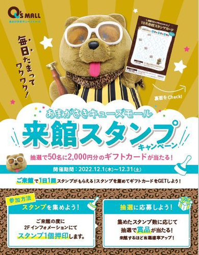 あまがさきキューズモールでは、正面エントランスのイルミネーションがスタートする他、行けば行くほどギフトカードの当選確率が上がる「来館スタンプキャンペーン」や、買えば買うほど抽選に応募できる「笑いが止まらないキャンペーン」等、何度行っても楽しめるイベントが開催されます。