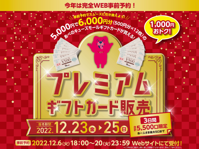 もりのみやキューズモールBASEでは、1000円分がオトクになるプレミアムギフトカードを販売します。2日間、各日先着350口限定販売のお得に買い物ができるチャンスです。