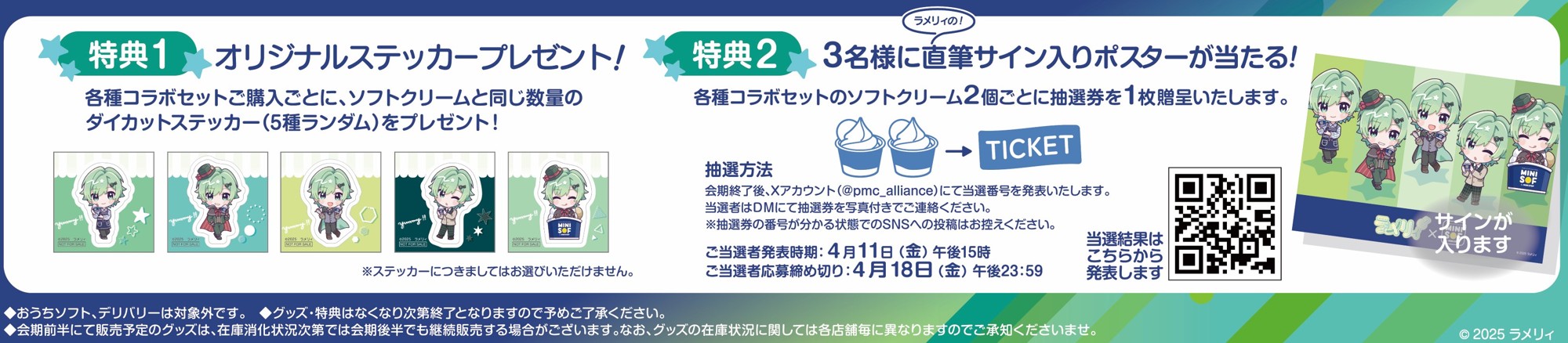 ①各種コラボセットをご購入いただいたお客さまに、ランダムでソフトクリームと同量のステッカーをプレゼント!