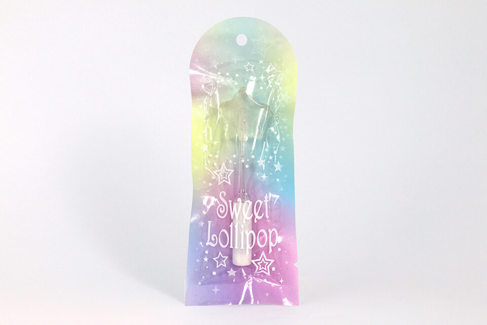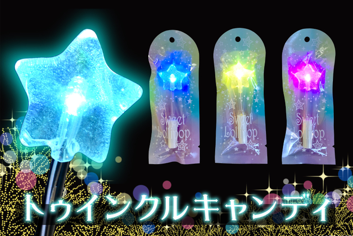 トゥインクルキャンディは、スティック下部にあるスイッチを押すと、スティック内部のLEDがレインボーカラーにピカピカと光るフォトジェニックなキャンディです。