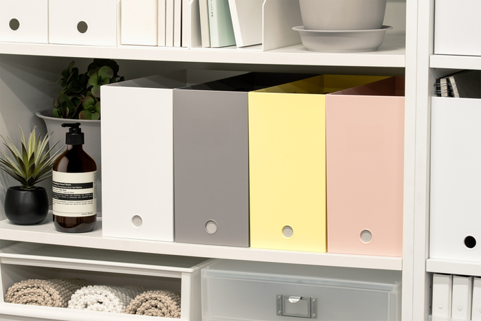 在宅勤務やリビング学習などで使用する筆記用具や電源タップ、ガジェット類のような小物をひとまとめにしたり、シンクの下やパントリーなどで掃除用品や消耗品のストックをしたりとファイルボックスのポテンシャルを最大限に引き出します。