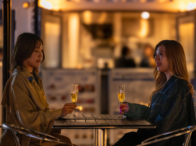花火鑑賞の前後は、会場内で同時開催中の都会型Outdoor Music Party「URBAN FLOW」(17:00〜21:00)へ入場いただけます。中之島のオフィスビル群が織りなす幻想的な夜景を背景に、Chill HouseやNu-Jazzなどの洗練されたサウンドスケープが融合。会場には焚き火(ファイヤーピット)が設置され、ゆらめく炎を眺めながら、ウェルカムシャンパンを片手に大人の「Chill体験」を引き続きお楽しみいただけます。