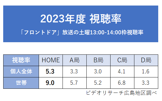 「ひろしま深掘りライブ フロントドア」個人視聴率・世帯視聴率いずれも1位!