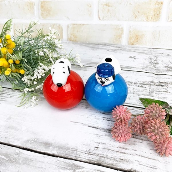 赤くて丸いフォルムの本体に、スヌーピーが乗っかったオキアガリコボシです。
