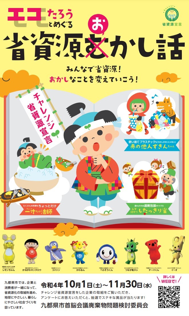埼玉県、千葉県、東京都、神奈川県、横浜市、川崎市、千葉市、さいたま市、相模原市で構成される「九都県市首脳会議廃棄物問題検討委員会」では、ワンウェイプラスチック製品(使い捨てプラスチック製品)、容器包装、食品廃棄物の減量化やリサイクルを促進するため、「チャレンジ省資源宣言」事業を推進しています。2022年は「エコたろうとめぐる省資源おかし話」をテーマに、省資源につながる情報発信などと合わせ、この取組を多くの方に知っていただくために「チャレンジ省資源宣言プレゼントキャンペーン」を2022年10月1日(土)より実施します。
