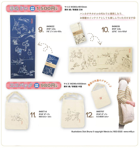 「誕生65周年記念 ミッフィー展」 にて登場した、miffyと平安時代から鎌倉時代前期にかけて描かれた鳥獣戯画のオリジナルグッズ。発売開始よりツイッターなども大きな反響を呼びながら、展示会先行発売のために全国のミッフィファンから待ち望まれているシリーズです。2020年9月12日に一般発売が解禁されました。