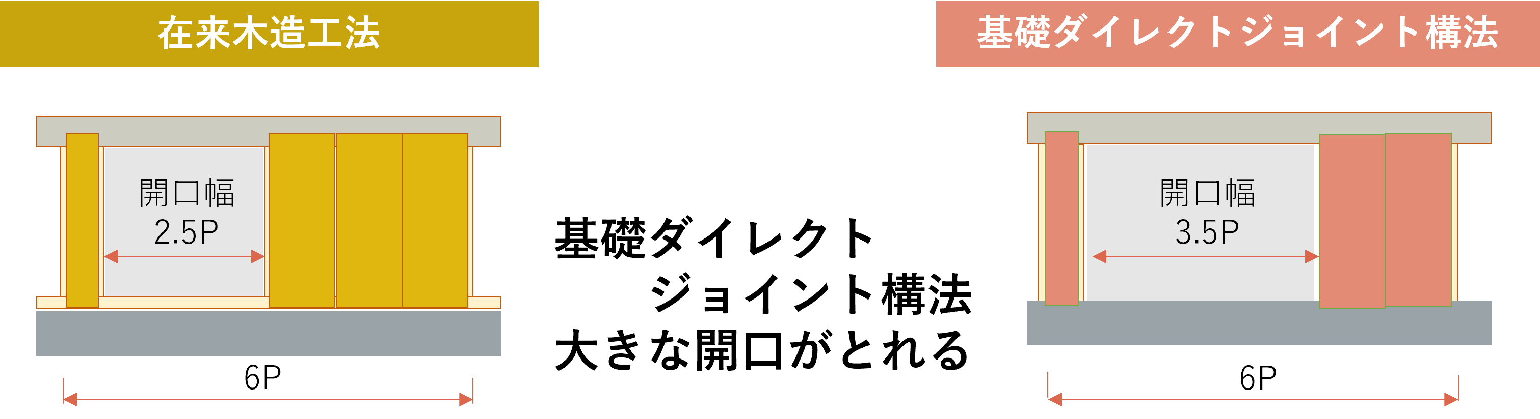 また「耐力壁」については、今までも一般的な木造住宅の耐力壁より厳しい評価基準で設計してきましたが、「基礎ダイレクトジョイント構法」の導入により「高強度耐力壁」を活用し、プランによっては大きな開口(窓)がとれるようになるなど提案力アップも魅力となります。