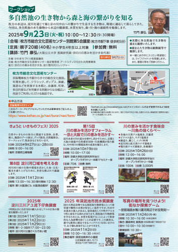今回の秋バージョンでは「伏見の街づくりと『水」」、「伏見みなと物語 ~生まれる港・失われた港~」テーマとする講演会並びに「多自然池の生き物から森と海の繋がりを知る」と題して淀川の生き物を捕まえ観察するワークショップを開催します。地域の身近な自然や歴史・河川や水文化にふれ、まちの奥深さを楽しみながら京阪沿線をぶらり巡ってみてはいかがでしょうか。