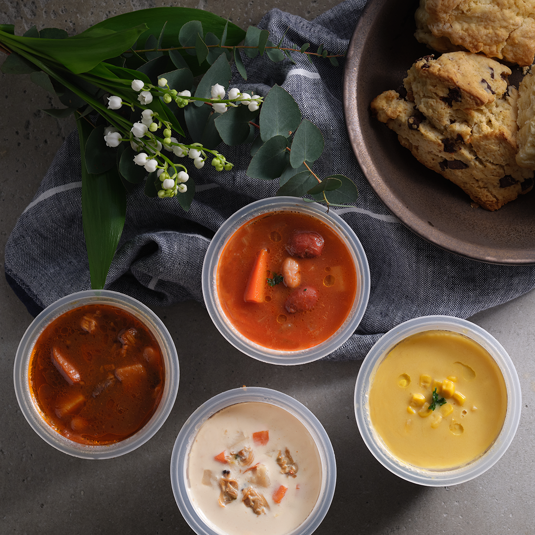定番のコーンスープやミネストローネ、食べ応えのあるボルシチやクラムチャウダーなどベジMOTTOシリーズは現在10種類のフレーバーをご用意。※季節によって一部販売停止しているものもあります。お好みに合わせて、ご家族それぞれなどお好きなものをお楽しみいただけます。