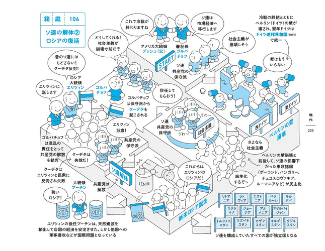 ゆるいタッチのイラストで描かれたクォータービュー(箱庭)とわかりやすい文章で、世界史の全体像とその流れをザックリ掴むことができます。