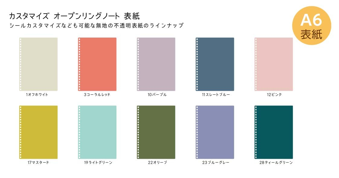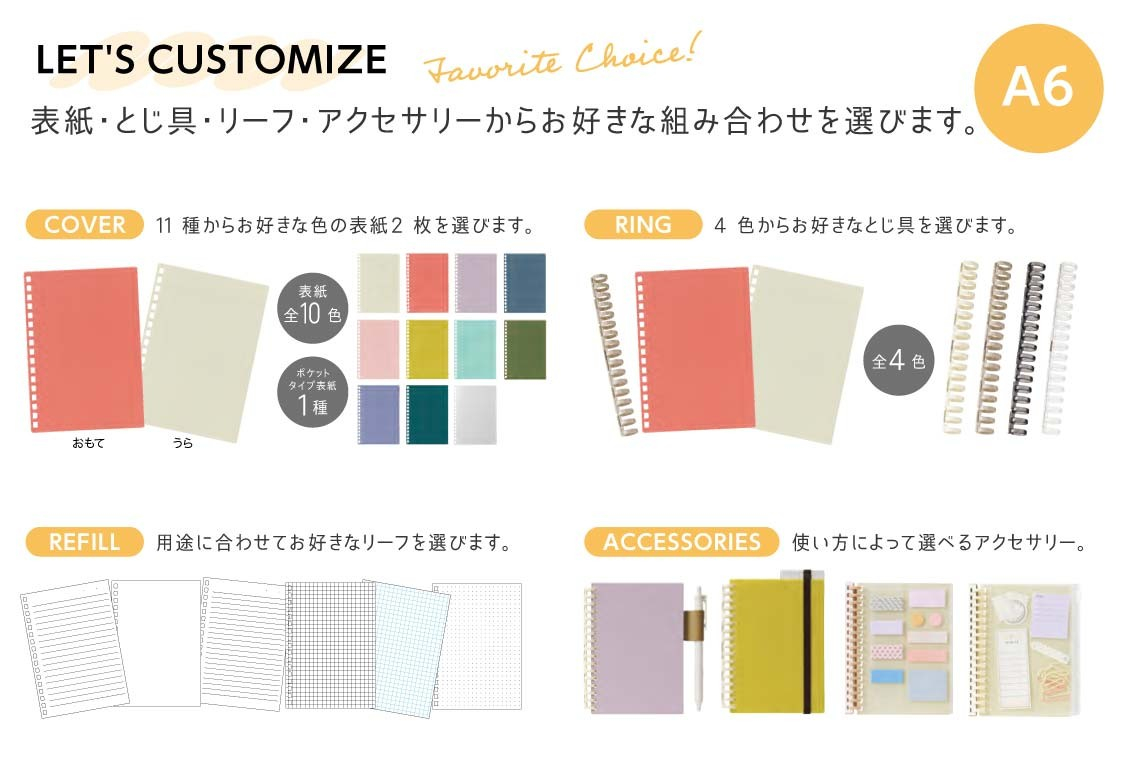 オープンリングノートのサイズ展開としても人気の高い『A6サイズ』が、ユーザーの声からカスタマイズシリーズとしてラインナップ!自分なりの組み合わせで簡単にオリジナルノートが作れます。