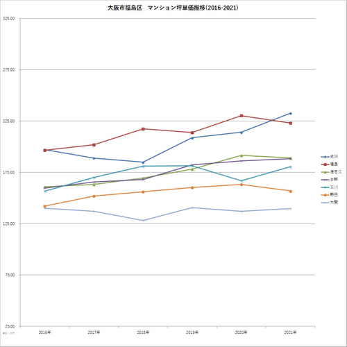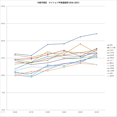 「不動産×WEB×ビッグデータ」の領域で、さまざまな不動産テックサービスを展開する株式会社ワンノブアカインド(本社:東京都港区、代表取締役社長:川島 直也、以下当社)は、当社が運営するマンション情報サイト「マンションレビュー」の保有データを元に、「大阪都心6区(福島区・西区・天王寺区・浪速区・北区・中央区」の各町名における、中古マンション相場および2016年からの相場推移について調査。最新の中古マンション価格*1とあわせて、2016年の坪単価と比較した騰落率のランキングを発表いたします。