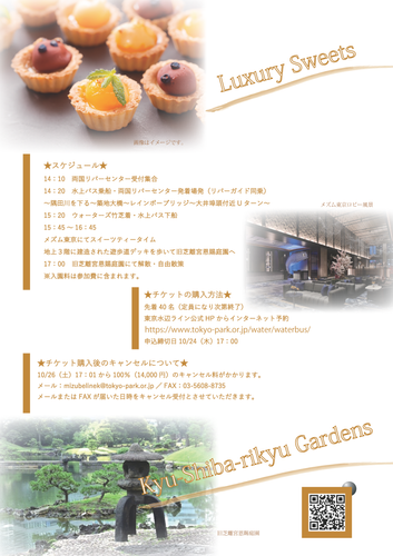【10/24まで申込受付】『極上のスイーツ』『クルーズ』『国指定名勝の特別イベント』を楽しめる 「水上バスで行くラグジュアリーツアー ~メズム東京のスイーツティータイムと夕暮れの庭園散策~」