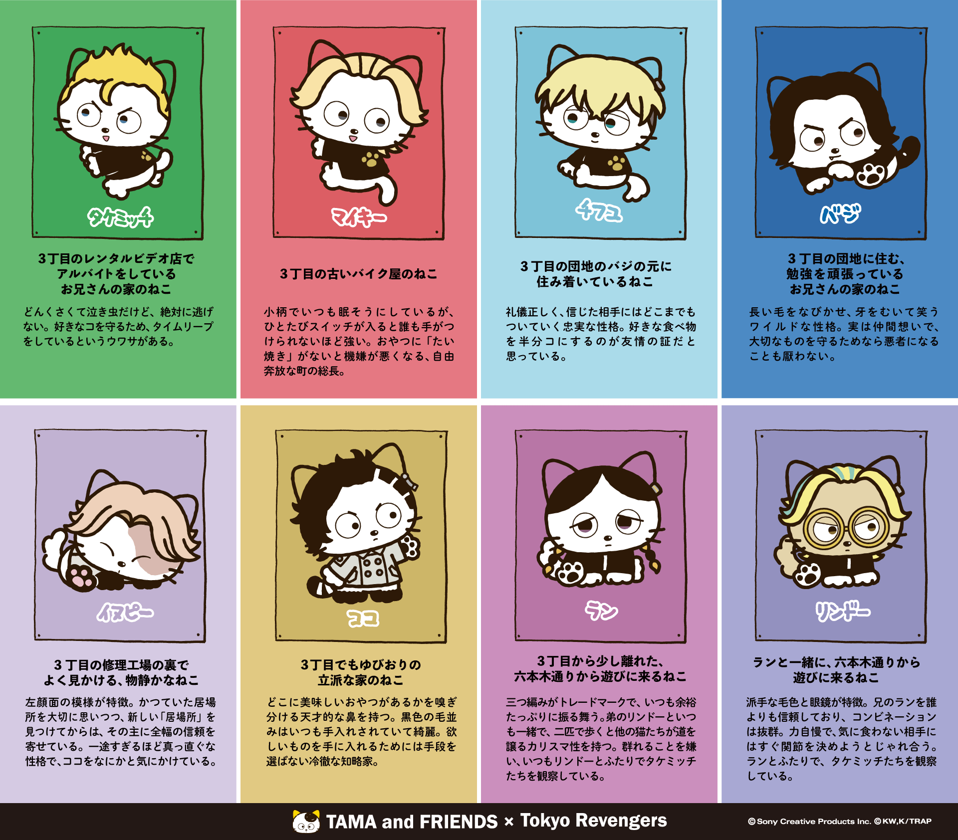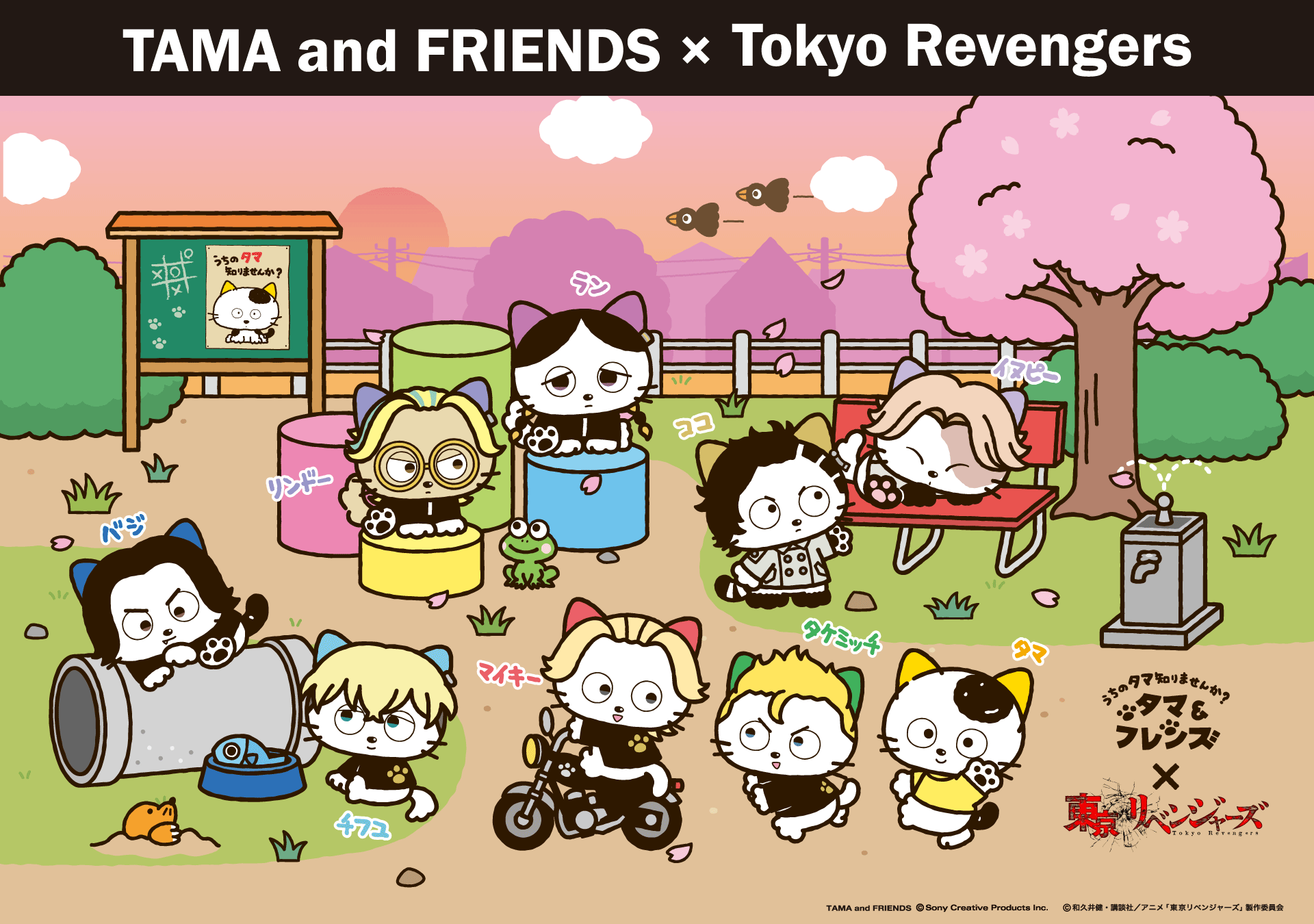 株式会社ソニー・クリエイティブプロダクツ(本社:東京都港区、代表取締役社長:大竹 健、以下SCP)のオリジナルキャラクター「タマ&フレンズ~うちのタマ知りませんか?~」は、1983年に雑貨デビューし2026年に43年目を迎えた歴史あるキャラクターです。90年代に初放送されたアニメ作品などを通じて、タマと仲間たちが過ごす日常が描かれています。一緒に遊んだり、ときには喧嘩することも。でも仲間のためなら、頑張れる。そんなタマたちが住む3丁目の世界に、大切な仲間との絆・青春を描いた『東京リベンジャーズ』のみんながやってきたという世界観の元、今回のコラボが実現しました。大切な仲間(フレンズ)が集まった異次元のコラボにぜひご注目ください。