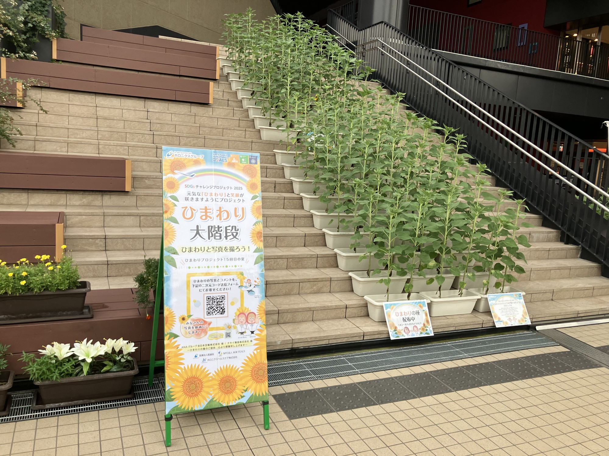 今年で5回目を迎える「ひまわりプロジェクト2025」では、i-Mallの劇場「扇町ミュージアムキューブ」横の大階段にて、 「サンリッチひまわり」(©タキイ種苗株式会社)が間もなく開花を迎えます。今年からは、向かいの扇町公園内でも、同じくサンリッチひまわりをご覧いただけるようになりました。この活動は、ANAグループ 全日本空輸株式会社様より種のご提供を受け、地域の皆さんとともに育てようという取組みです。 「大切な人の無事を祈り、安心安全を願う」 という想いを込めて育てられた黄色いひまわりたち、夏空の下で凛と咲きそろう様子は清々しく、訪れる人の心を明るく照らします。