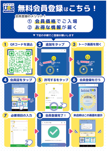 キッズランドUSでは、LINEにて無料会員登録をしていただくことで、一般価格より大変おトクな会員価格でご入場いただける【デジタル会員証】システムを実施しております。