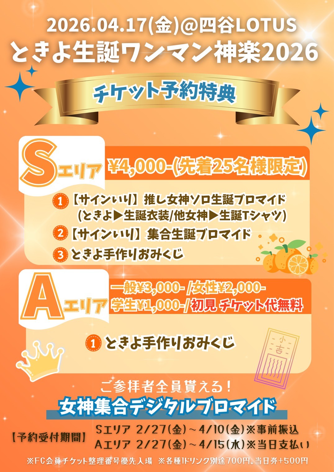 予約受付期間:Sエリア 4/10(金)23:59まで 事前振込み/Aエリア 4/15(水)23:59まで 当日払い