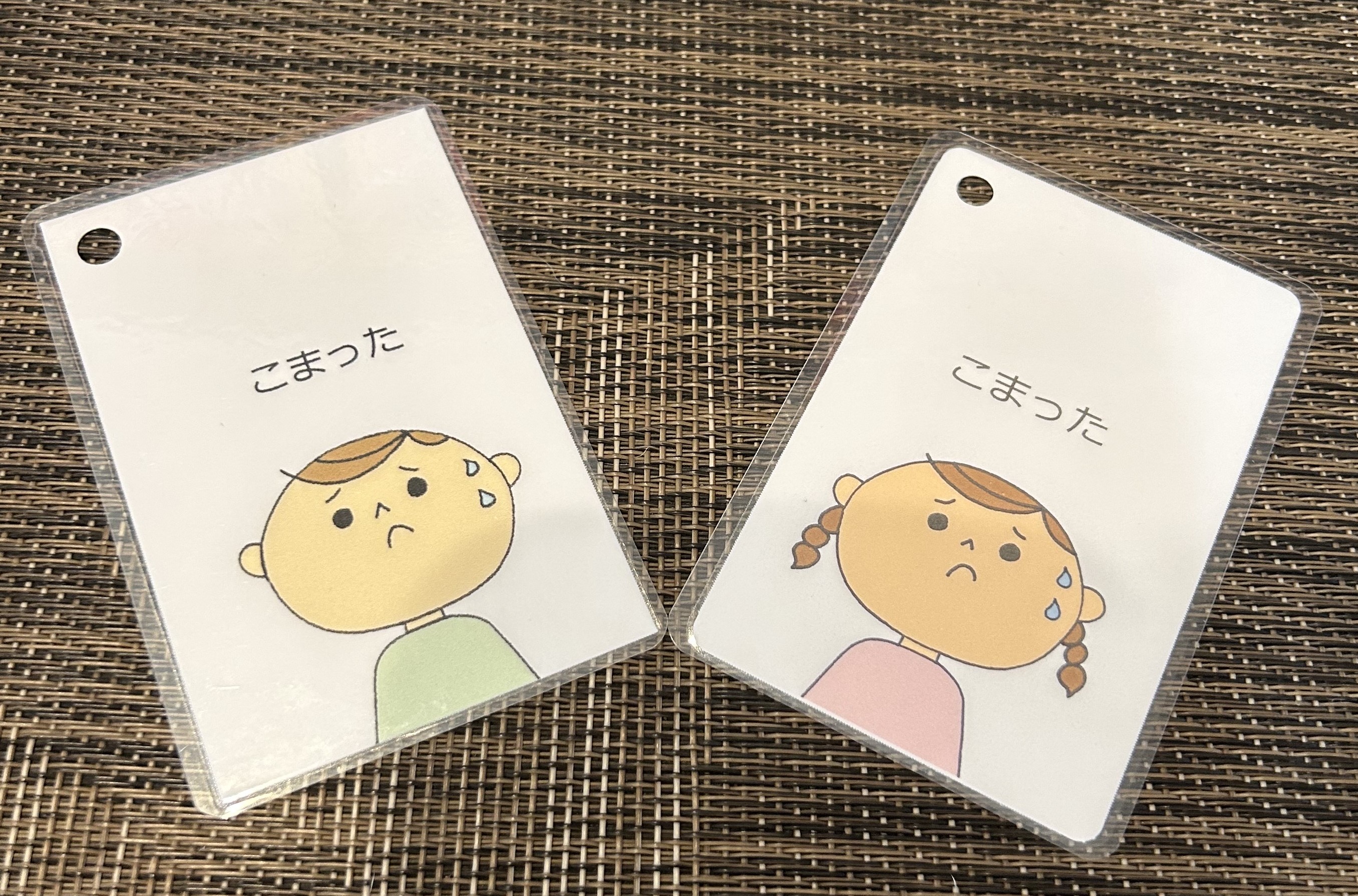 言葉として自分の気持ちを他者に伝えることに抵抗があったり、苦手だったりするようなお子さんの場合には、お守りがわりとしてカードを携帯し、助けてほしい、手伝ってほしい人にカードを差し出して気持ちを伝えてもらいましょう。