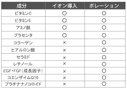 同じような美容施術の「イオン導入」は美容成分をイオン化して浸透させる施術ですが、コラーゲンなど分子の大きい成分は浸透が難しいなどの条件や、イオン化できない成分もあります。