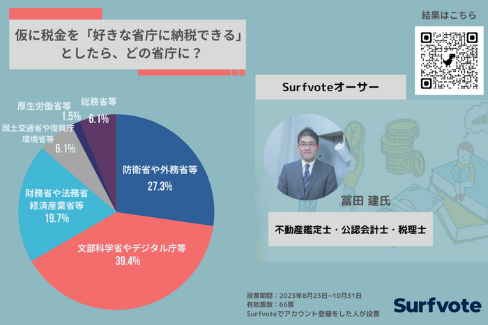 好きな省庁に納税できるとしたら、どの省庁に?「文部科学省やデジタル庁等、今後の日本の発展のための省庁」が約4割。「税金は次の世代への投資に」「日本の未来は若い世代のもの」などのコメントが寄せられた。