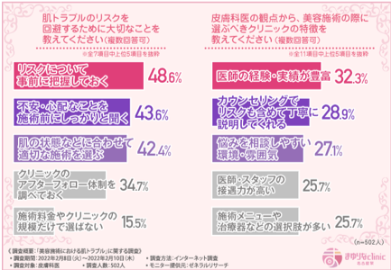 そこで、「肌トラブルのリスクを回避するために大切なことを教えてください(複数回答可)」と質問したところ、『リスクについて事前に把握しておく(48.6%)』と回答した方が最も多く、次いで『不安・心配なことを施術前にしっかりと聞く(43.6%)』『肌の状態などに合わせて適切な施術を選ぶ(選べるクリニックで施術を受ける)(42.4%)』と続きました。