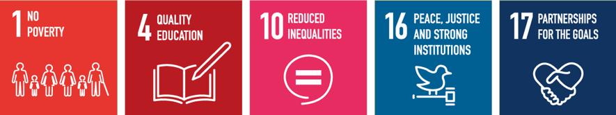 SDGsの17の目標のうち1,4,10,16,17の項目に該当し、2030年の目標達成に向けて推進していきます。