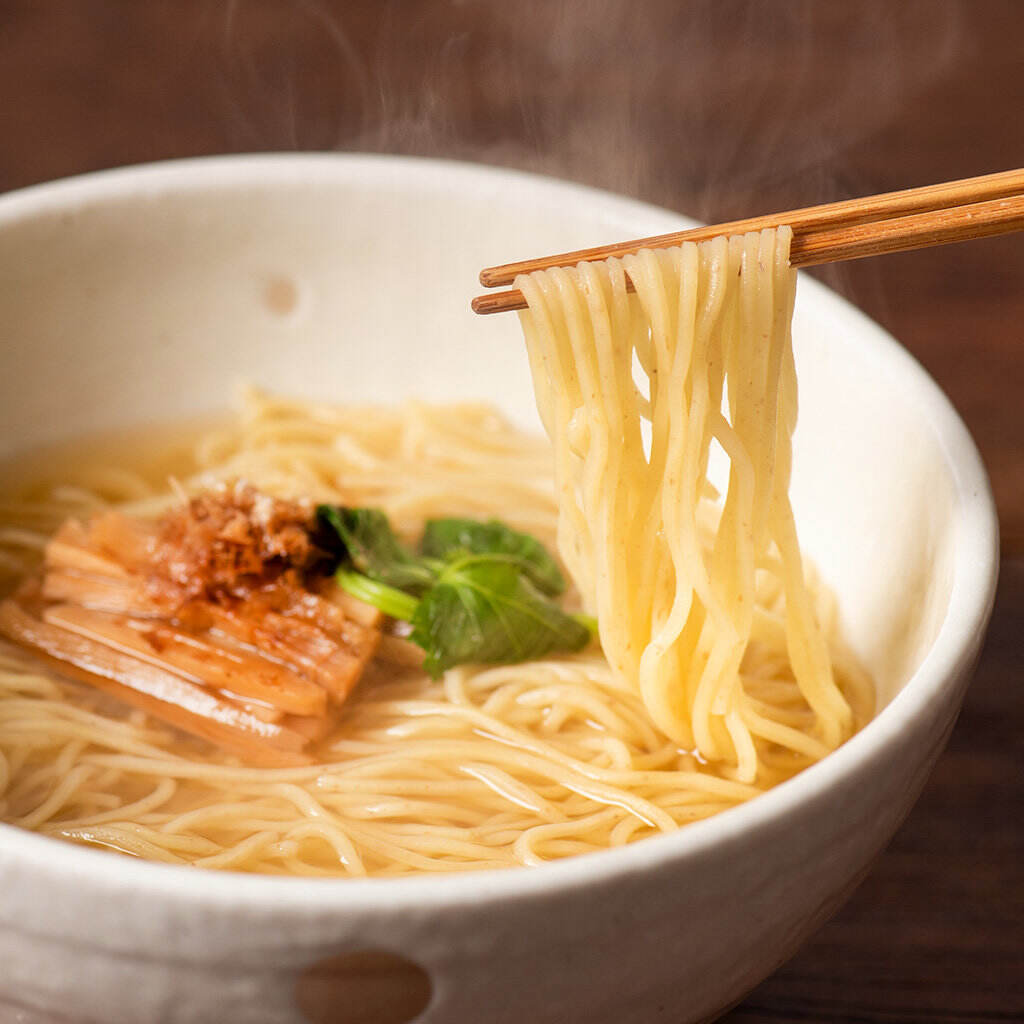 久世福商店の「素材の、うまみ引き立つ。毎日だし」をベースに、チキンやポークのうまみを合わせ、醤油で味を調えたスープは極上の味わいです。めんには全粒粉を練り込むことで、小麦本来の風味とおいしさがより引き立ちます。しなやかでコシのある、ノンフライ製法の細めんは、醤油スープと相性抜群!付属の鰹本枯節をトッピングしていただくと、鰹節の香りが漂う、より贅沢な味わいになりますよ。