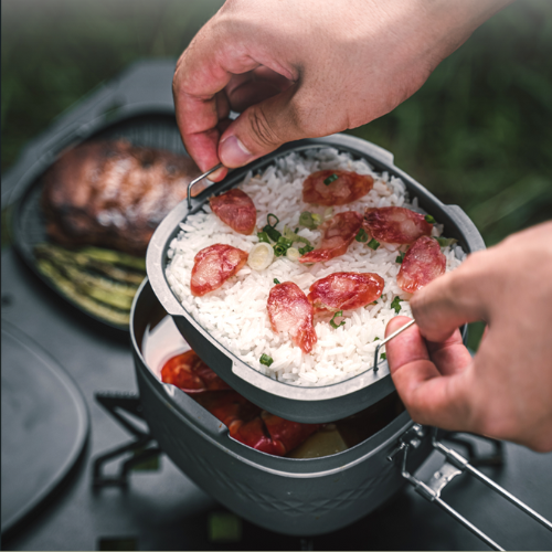 Rugged Sear多機能調理セットは、ご飯を炊く鍋、食材を蒸す蒸し器、肉や魚を焼くグリルプレートの機能をひとつにまとめました。これひとつでキャンプなどの限られた環境でも時短に燃料を節約しつつ、本格的な料理を楽しむことができます。