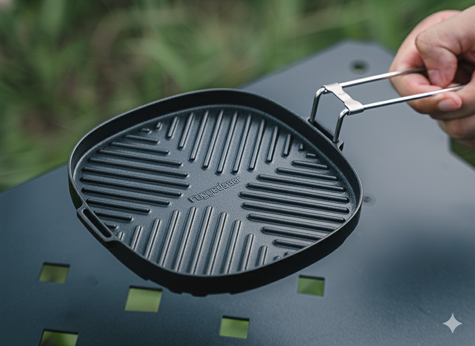 金属製の調理器具とは思えないほど軽量で、わずか約600gという重さは一般的なペットボトル1本分に相当します。バックパックに入れても負担にならず、バイクキャンプや徒歩でのアプローチが必要な場所でも気軽に持ち運べます。従来のように重たい鉄板や複数の鍋を持ち歩く必要がなくなりました。