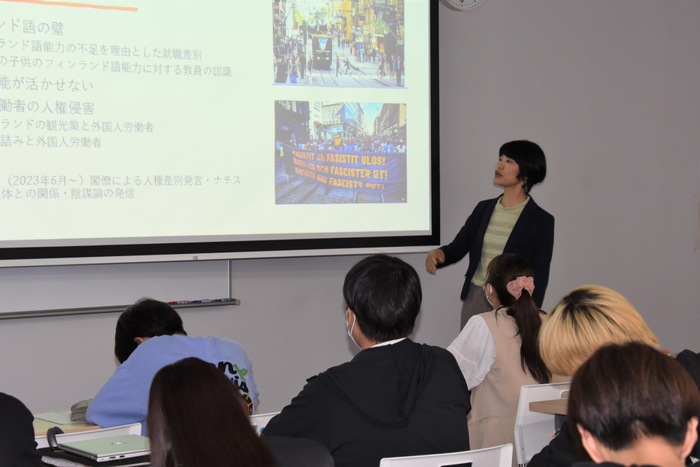 ヘルシンキ大学(フィンランド)文学部の講師で社会学者の朴沙羅(ぱく・さら)さんが7月16日、ナゴヤドーム前キャンパスで都市情報学部の稲葉千晴教授が担当する1年次開講科目「都市学英語1」のゲスト講師として登壇し、「フィンランドと外国人の壁」と題して学生約30人に外国人をめぐるフィンランドと日本の社会の問題や両国の共通点と相違点などを解説しました。