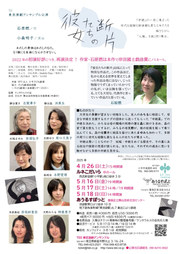 東京演劇アンサンブル主催、『彼女たちの断片』が2025年5月16日 (金) 〜 2025年5月18日 (日)にあうるすぽっと(東京都 豊島区 東池袋 4-5-2)にて上演されます。 チケットはカンフェティ(運営:ロングランプランニング株式会社、東京都新宿区、代表取締役:榑松 大剛)にて発売中です。