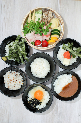 全ての定食は選べるのっけご飯と豆乳味噌汁・浅漬けがセットになっています