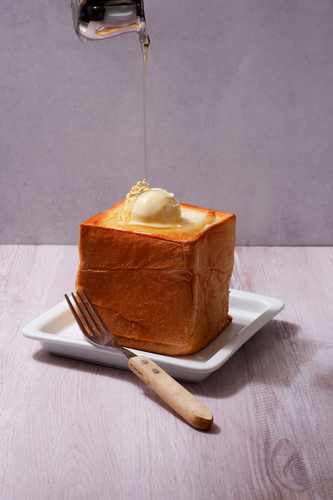 外はサクサク、中はふわふわ、しっとりなるよう焼き上げた約9cmの高さもある食パンに、バニラアイスを乗せてはちみつをとろ~りかけました。バターの甘じょっぱさと、はちみつの香りをまとった厚切り食パンに冷たいアイスがよく合います。