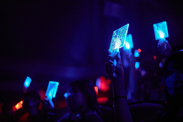 興味深いのは、ストーリーの展開が観客の手に委ねられていること。青・赤それぞれの色を切り替えて発光させるプレートを掲げることにより観衆は二者択一で物語展開を選び、数の多い方が採用される。「マルチストーリー」と称する、選択次第で物語が変わっていく趣向によって、観客も客席に安住して観ている訳にはいかないのだ。NORAとは何者か? 「東京C」はどういう目的で作られたのか? 謎が謎を呼ぶ物語から目が離せない。