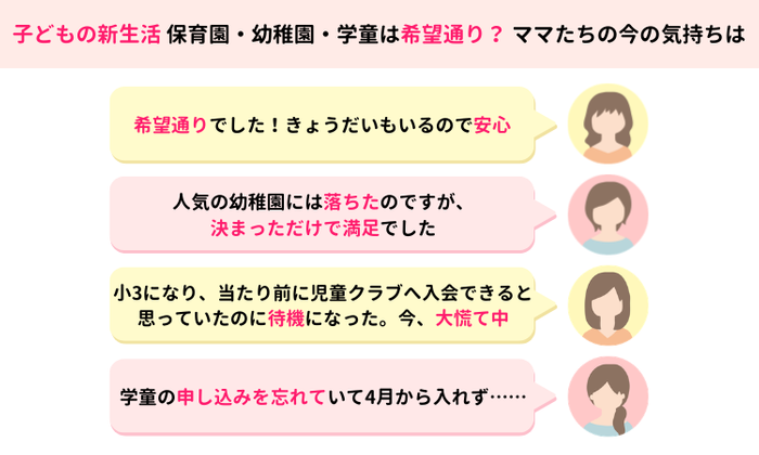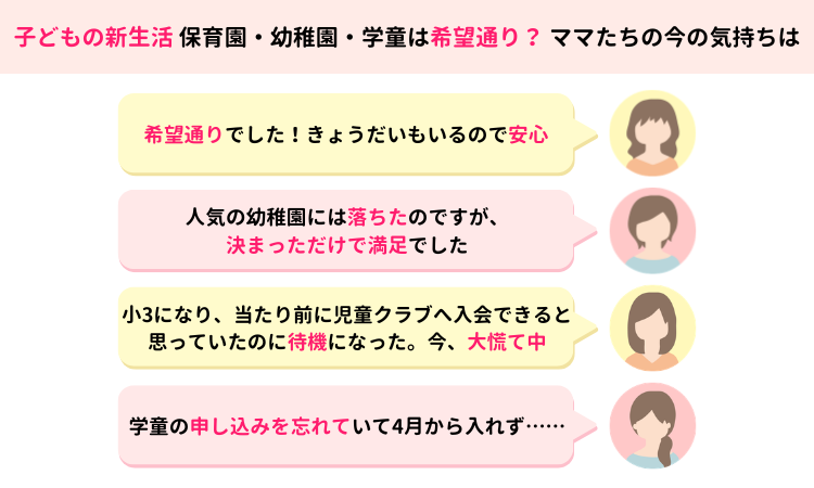第1希望の園に入れたことへの安堵やきょうだいで同じ園に通える安心感など、納得のいく園選びができた家庭も少なくないようです。一方で、新生活への不安を感じている声もありました。