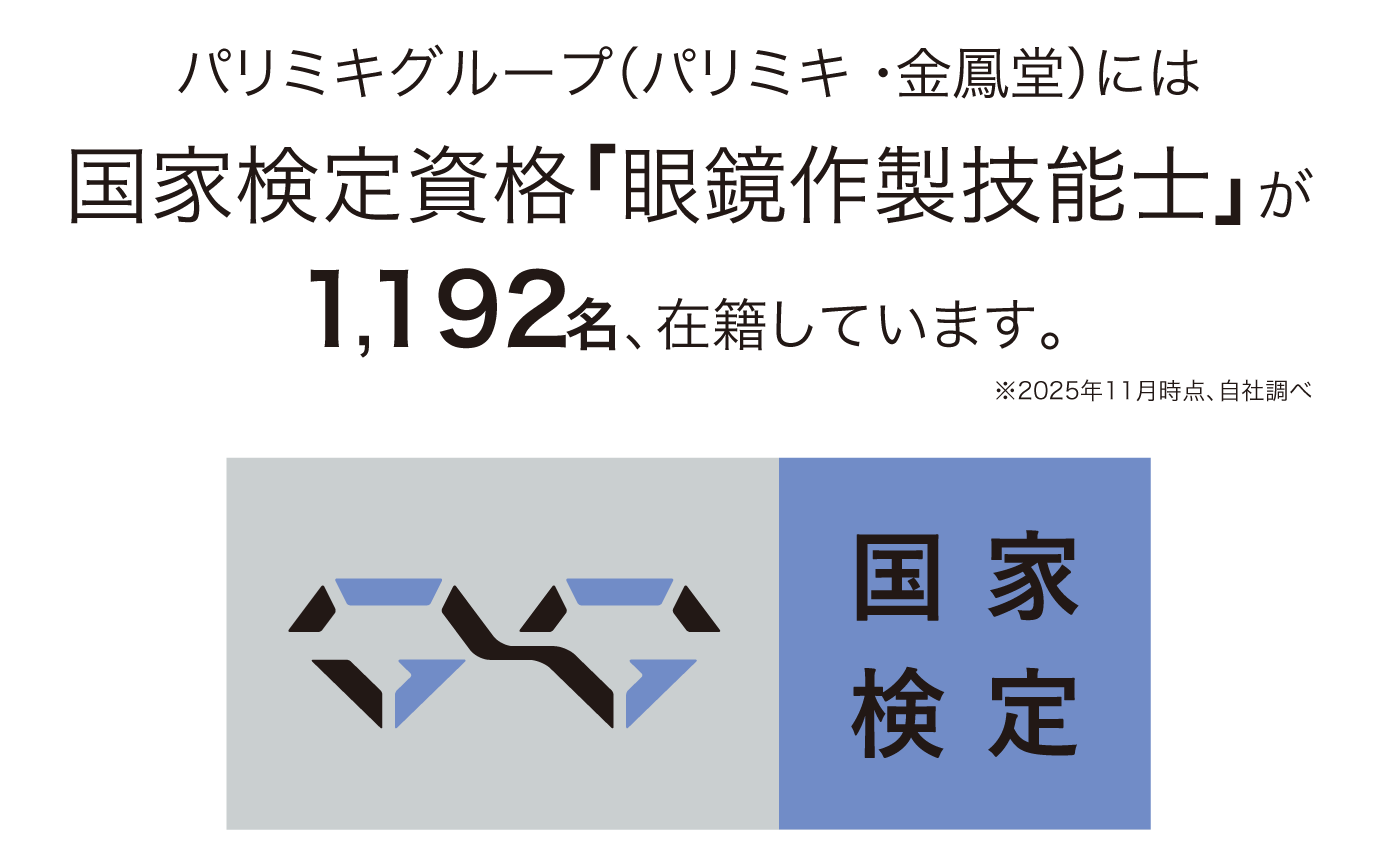 2022年4月より、国の定める「技能検定」の職種に「眼鏡作製職種」が新設され、国家検定資格「眼鏡作製技能士」がスタートし、パリミキグループでは現在1,192名の合格者が在籍しています。(※2025年11月時点、自社調べ)多様化・高度化するお客様のニーズにあわせて、「適切な診断・治療」と「適切な眼鏡作製」の双方の実現に向け、眼鏡技術者が眼科専門医と連携しつつ、皆様により良い眼鏡を提供し、目の健康を守れるよう、眼鏡作製の技能を高めてまいります。