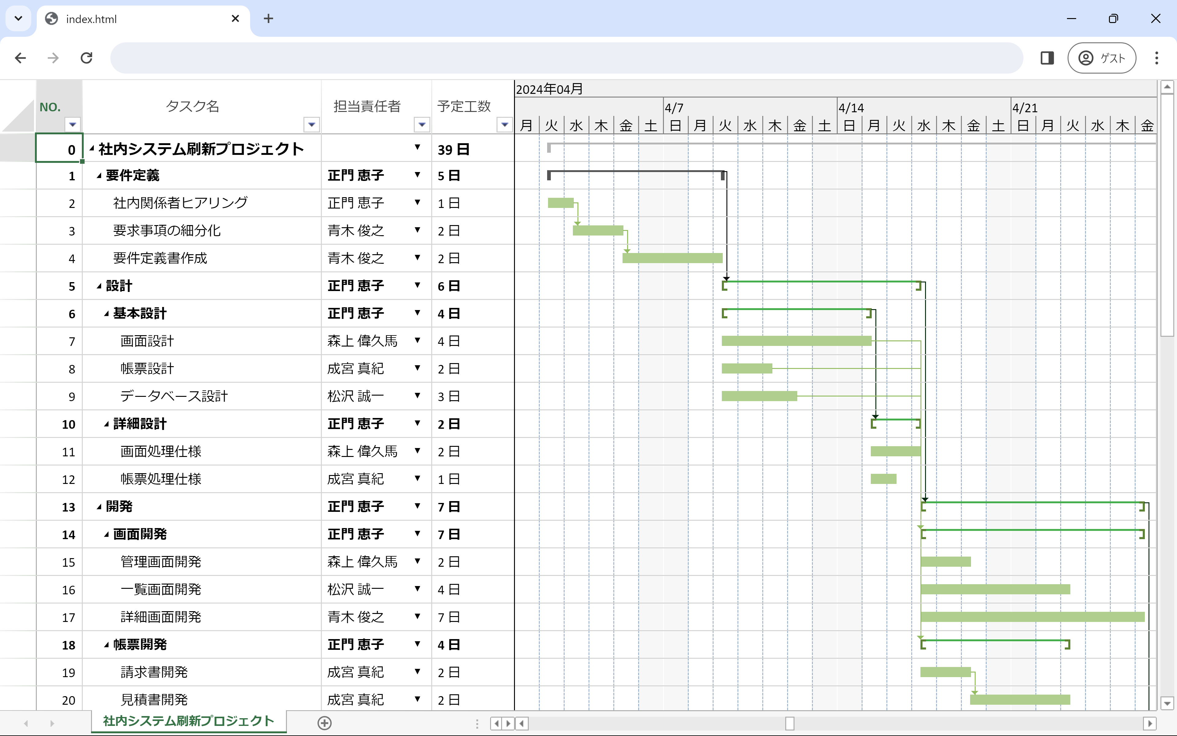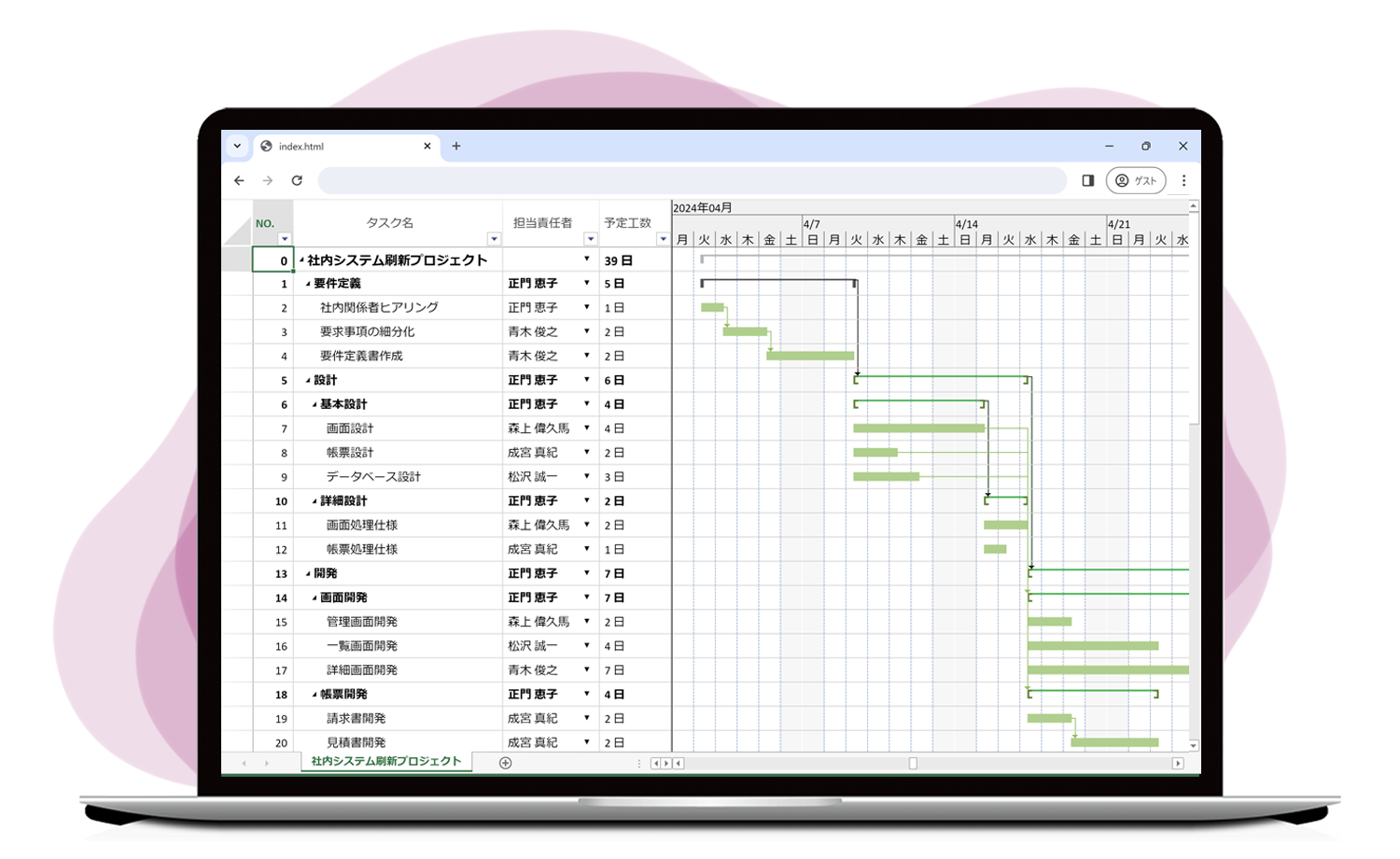 プロジェクト管理や生産管理などで使用されるガントチャートをExcelライクなUIで作成できる「ガントシート」機能を追加しました。ガントシートではタスクの追加や編集、削除をExcelライクなUIで操作することができます。また、タスクバーをドラッグアンドドロップするだけでタスクの期日や先行後続タスクを変更できるので、いちいちセルからデータを入力する必要もありません。さらに、ガントシートのスタイルは自由にカスタマイズ可能です。タスクバーのスタイルやグリッド線、非稼働日のスタイルなど要件に合わせて利用できます。