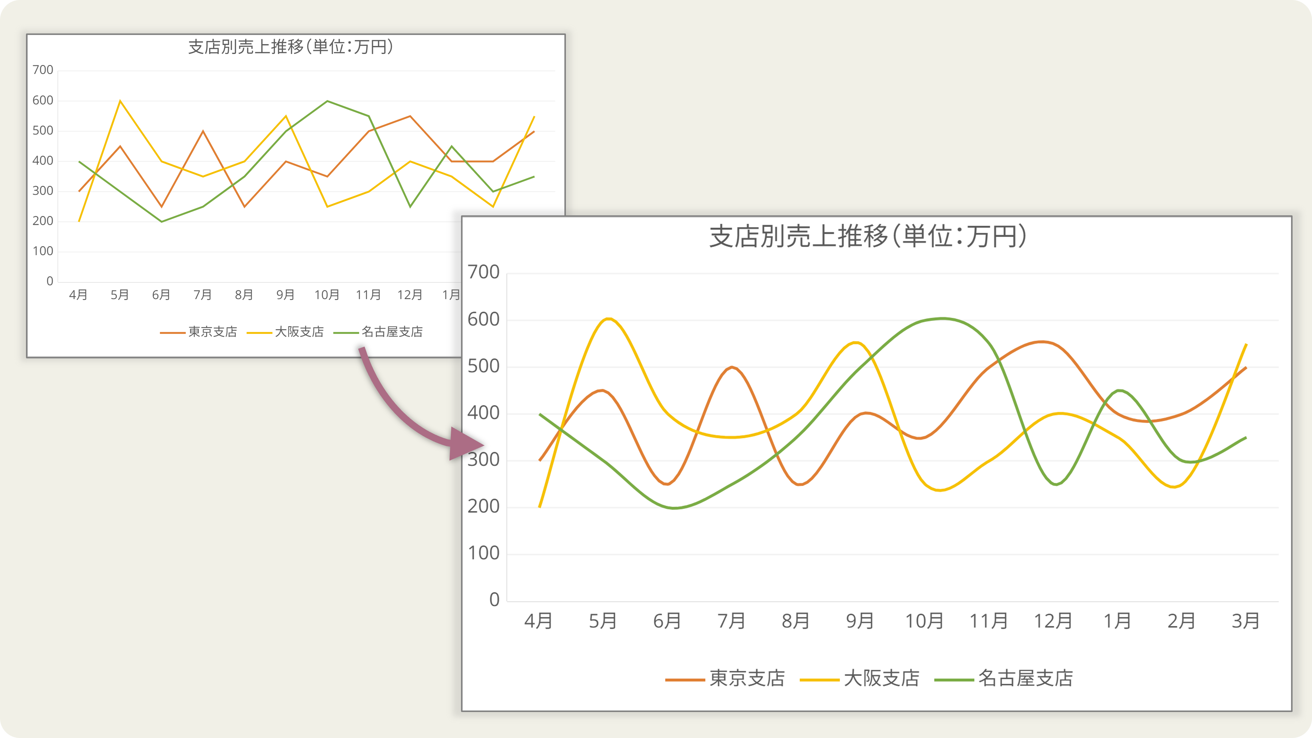 さらに折れ線チャートでは、表示されている線について、直線だけではなく曲線を用いて滑らかに描画ができるようになりました。