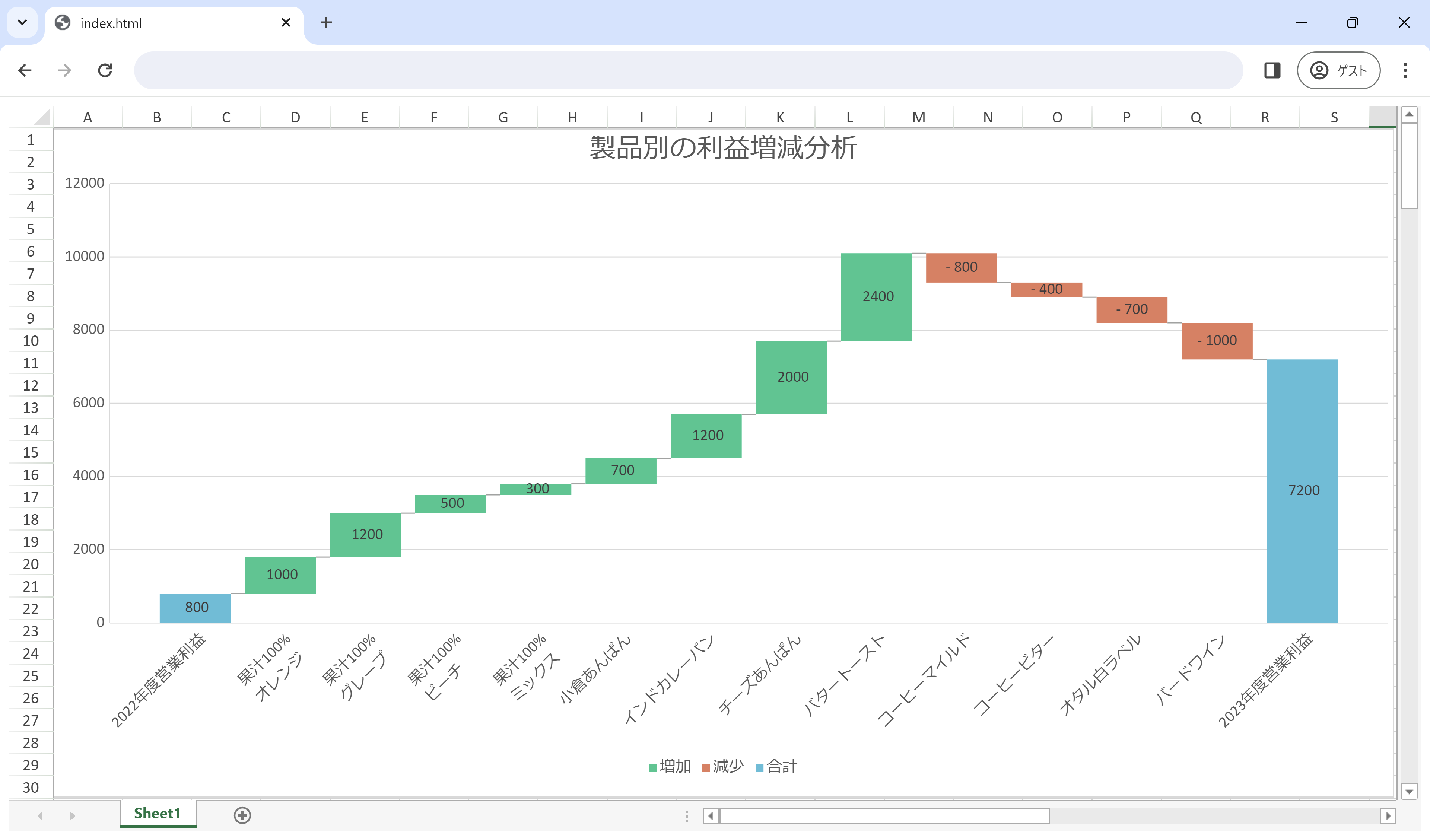開始時点と終了時点の間における各種数値の増減を可視化して分析できる「ウォーターフォールチャート」が使用できるようになりました。決算報告資料や社内報告資料など幅広い用途で利用が可能です。