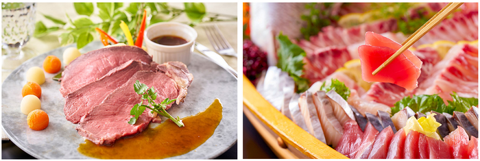 ご馳走メニューは、お肉派にはライブキッチンでお客様の目の前で切り分ける「ローストビーフ」を、お魚派には「お造り」をご用意いたしました。