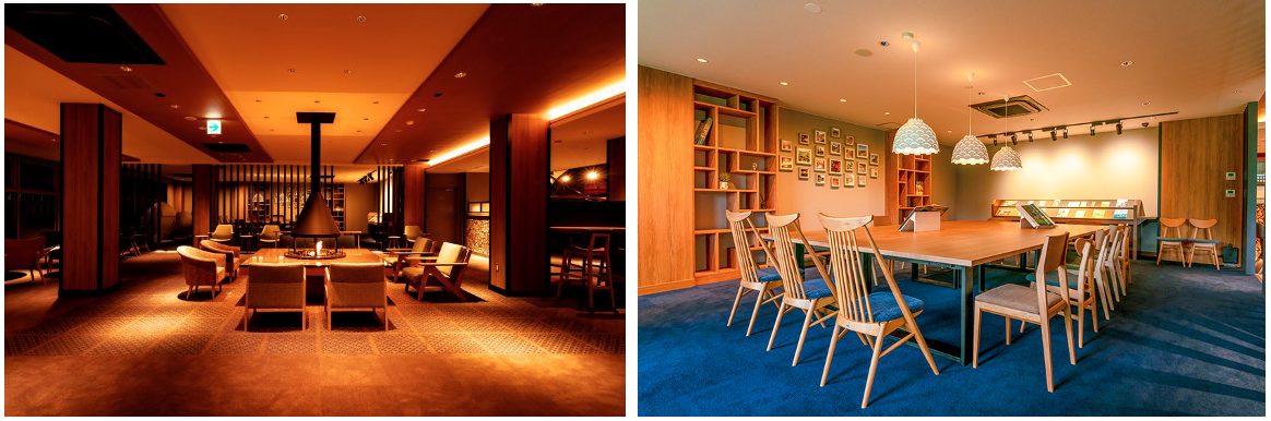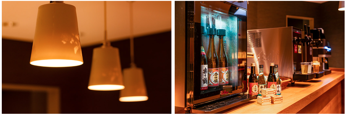 左:プレミアムラウンジのドリンクカウンターの上や、ライブラリー、テーブル上のライトカバーは豊岡市出石町で作られる磁器「出石焼」を使用。透き通るように白い滋肌に浮彫りや透かし彫りの精緻な紋様が施された味わいのある作品をお見逃しなく。