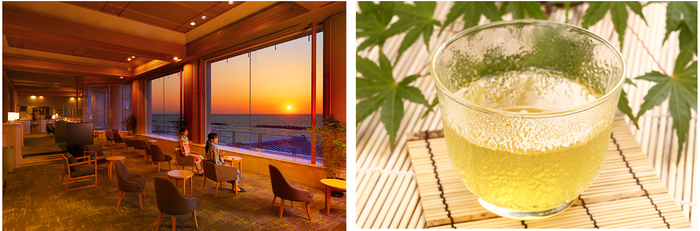 右:Premium 汐美荘ならではの1杯。地元契約栽培農家の方が育てた岩沼産コシヒカリの玄米を使用した玄米茶。玄米の香ばしさを残しながら、すっきりとした味わいで何杯でも飲みたくなる美味しさです。