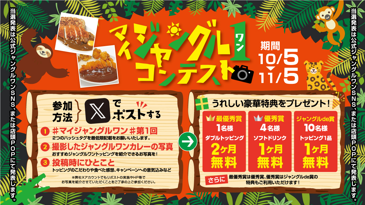 株式会社ルーキーファーム(本社:北海道帯広市西5条南34丁目12番地、代表取締役社長:加藤 祐功、以下 当社)は、カレーShop ジャングル1にて2023年10月5日(木)から2023年11月5日(日)の期間中、X(旧:Twitter)にて「マイジャングル1コンテスト」を開催します。ジャングル1のカレーに皆様のお好みのトッピングを行い「私のジャングル1カレー = マイジャングル1」としてX(旧:Twitter)のポストにてエントリー可能です。