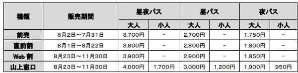 【料金】上記、夜パスまたは昼夜パスのとおり