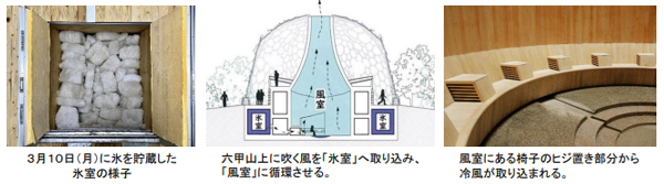 「自然体感展望台 六甲枝垂れ」では、早春に近隣にある六甲山スノーパークのゲレンデの雪を約20トン切り出し、「氷室(ひむろ)」に貯蔵しています。氷室の扉を開放して六甲山上に吹く風を取り入れる「氷室開き」を7月11日(金)に実施する予定で、展望台内部の「風室(ふうしつ)」では氷室の氷が無くなるまで、神戸市街地と比べてマイナス約10℃の涼が楽しめる「冷風体験」を開催します。限られた期間のみ自然の力で生み出される巨大クーラーをぜひご体験ください。なお、冷風体験には六甲枝垂れの入場料が必要となります。